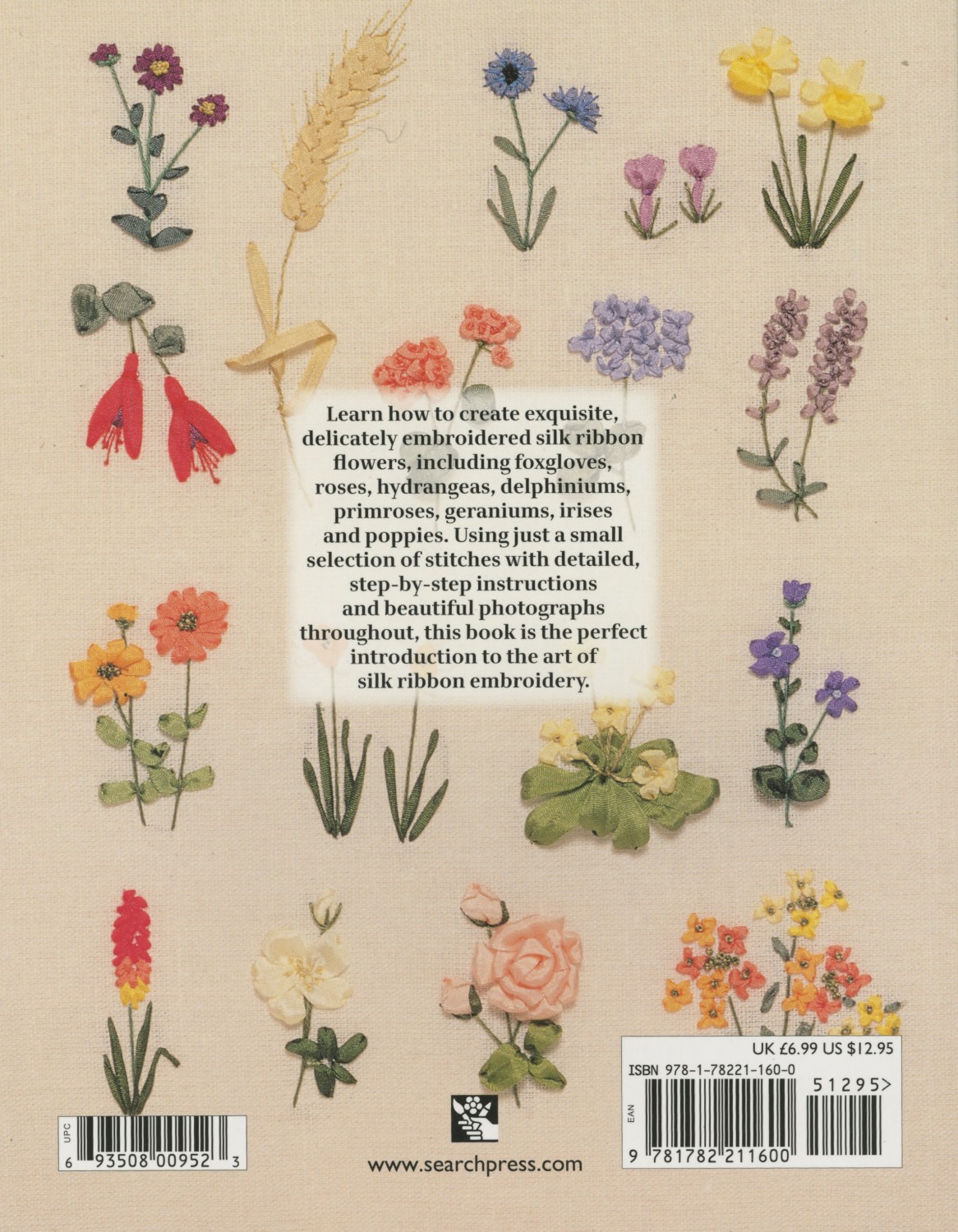 Learn how to create exquisite, delicately embroidered silk ribbon flowers, including foxgloves, roses, hydrangeas, delphiniums, primroses, geraniums, irises, poppies… and much more. A small selection of stitches are used to create a wide variety of flowers. All the techniques are explained in detailed step-by-step sequences.