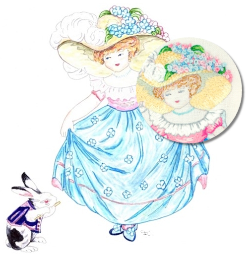 Stitches Used:  Split Backstitch, French Knots. Plus, Short Stitch Punch Needle for straw hat.