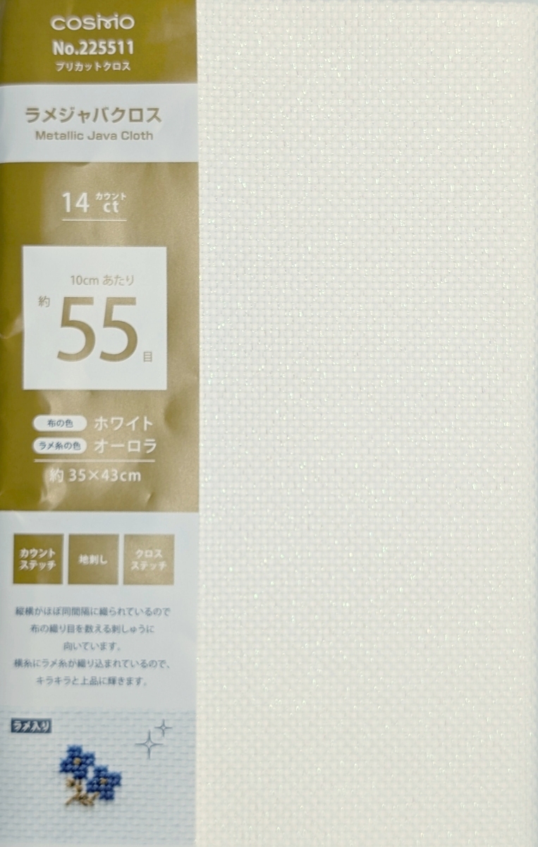 Cosmo Java Cloth is similar to aida type fabrics but with less starch and more drape.